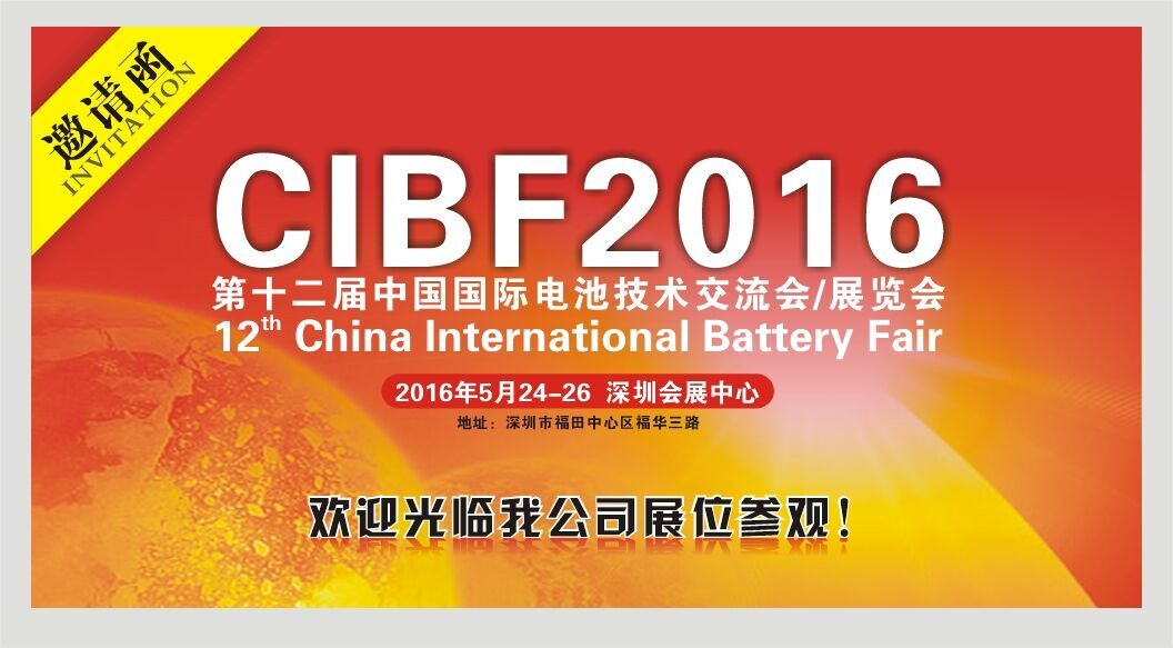 ? ? ? ?2016年5月24日-26日 ?第十二屆中國國際電池技術交流會/展覽會將在深圳市福田中心區(qū)福華三路,深圳會展中心召開,我司展位號:9F90號,歡迎廣大新老客戶,到我公司展位區(qū)域了解新產(chǎn)品和行業(yè)技術交流。